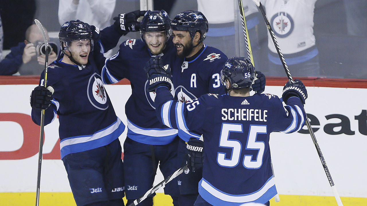 Winnipeg Jets' Andrew Copp (9), Joel Armia (40), Dustin Byfuglien (33) and Mark Scheifele (55) celebrate Armia's goal against the Minnesota Wild during first period game five NHL playoff action in Winnipeg on Friday, April 20, 2018. (John Woods/CP)