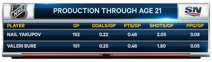By the numbers, this looks pretty close. It’d be a nice comparable for the Oilers, who would have to be very happy if Yakupov became the offensive force that Bure was before injuries stole away his career. Like Yakupov, Bure showed flashes early, scoring 22 goals as a rookie before stagnating for a couple of seasons. He ended up in Calgary, where he was spectacularly effective for three seasons, peaking with a 35-goal, 75-point effort in 1999-00 that put him just outside the top-10 league-wide in both categories.
