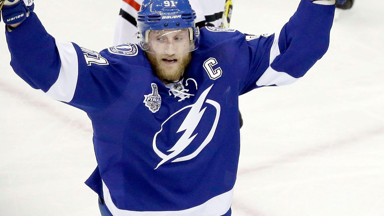 With the Lightning on a 4 on 3 power play Steven Stamkos sets up for a one timer and snaps his stick in two.