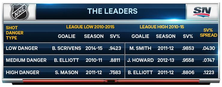 We expect Low Danger and Medium Danger SV% to move around a fair bit over the course of the season – they are both quite unpredictable, but generally most goaltenders will end up within a fairly narrow range. The chart shows the lowest and highest SV% in each danger zone for goalies with 2000+ minutes since the 2010-11 season: