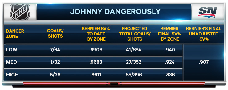 Assuming Bernier continues to roughly face the same distribution of Low, Medium and High Danger shots he’s faced so far this season over another 50 starts, he would end up with around 684 Low Danger, 352 Medium Danger and 396 High Danger shots at the end of the season. If we assume he finishes with an abysmal Low Danger SV% of .940 he would need to allow another 34 Low Danger goals this season – a total of 41 on the year.