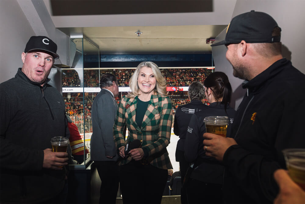 It’s gameday in Calgary and with puck drop still a few hours away, 29 women gather at centre ice. A freshly-cleaned sheet glistens beneath heels and work boots and sneakers. The soft sounds of careful shuffling and chatter and laughter carry through the empty Scotiabank Saddledome stands that will soon house fans.