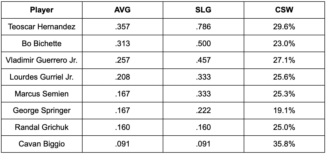 While Hernandez has had some difficulty making contact with the high-spin four-seamer, it’s clear that Gurriel Jr. and Biggio stand to be the major beneficiaries of new rule enforcement.