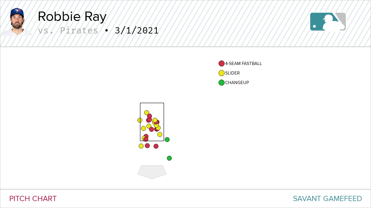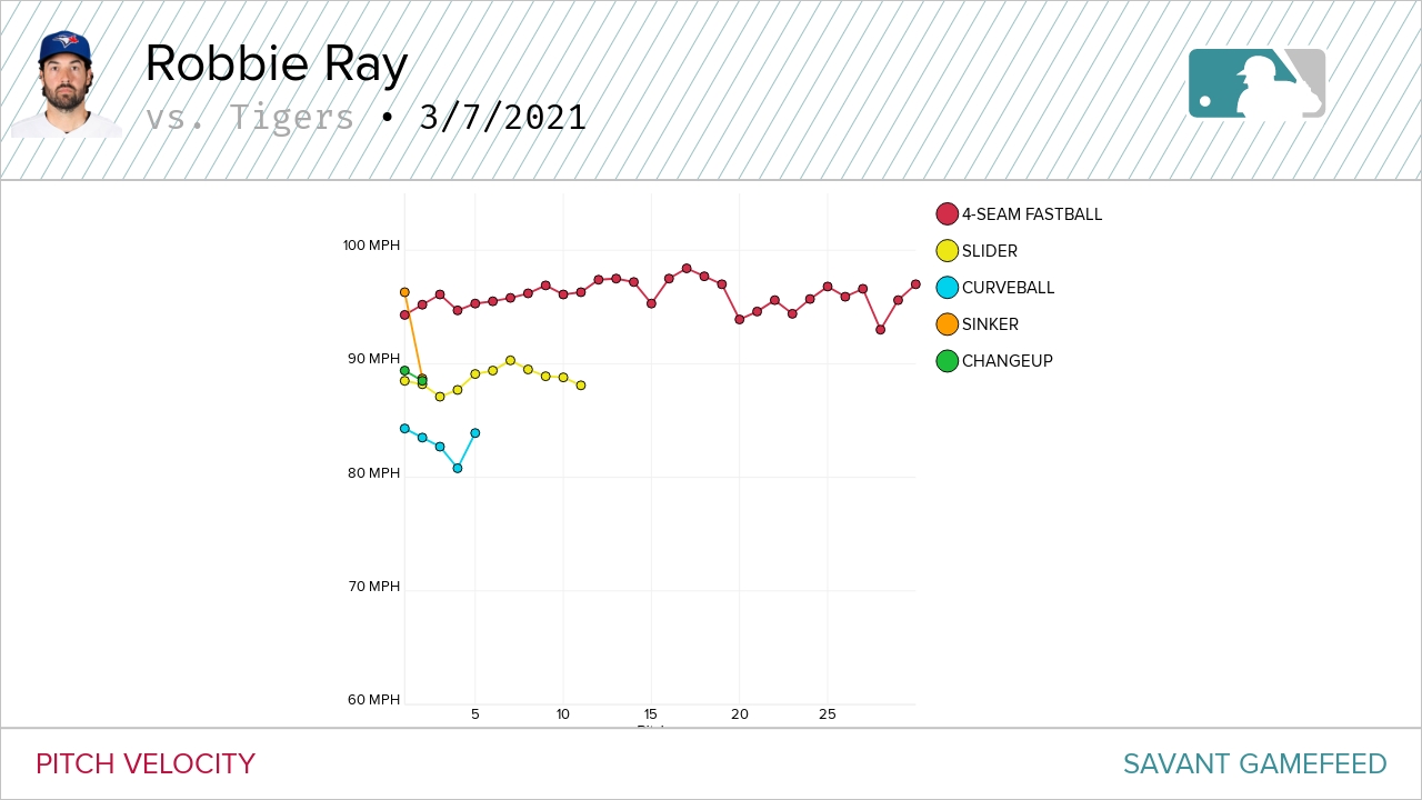 But then he made a mid-inning mechanical tweak following a mound visit from his catcher, Danny Jansen, and struck out the next three batters on 16 pitches, all but two of them strikes. Back out for his second inning, Ray went three-up, three-down on 14 pitches with a couple more strikeouts. And after getting the green light to return for a third, Ray responded with his sixth strikeout in the span of seven batters, punctuated by an 88 m.p.h. slider he got Robbie Grossman to chase outside the zone.