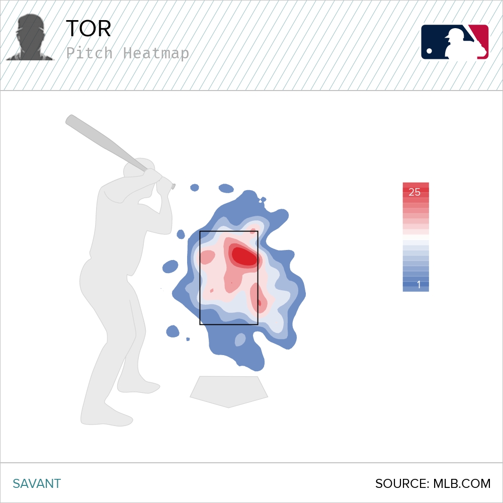 The Rays executed a clear strategy to attack the outer third of the plate, particularly up-and-away. Here’s a heat map of where Toronto’s right-handed hitters were pitched in that season-opening series: