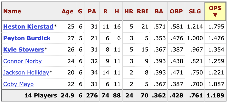 And they’ve been playing arcade baseball all week. Norfolk has plated nine runs or more in five of its first six games. They’re batting .362/.428/.761 as a team. Kjerstad has 16 hits through those six games. Stowers, Holliday, and Mayo have 11 each. Connor Norby — a 23-year-old who rarely even gets mentioned in Orioles prospect chatter despite hitting 50 homers across his first two full minor-league seasons — is batting .393/.438/.821.