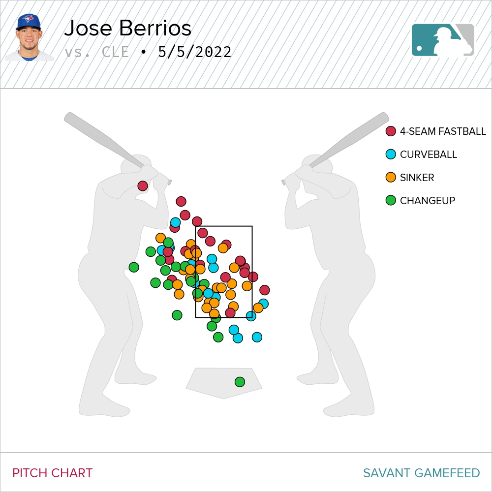 Conditions were much less than ideal for pitching, to be sure. The game was played in a steady rainfall from the third inning on, which made an already cold and unpleasant night into a downright miserable one and turned the pitcher’s mound into ground beef. That could explain some of the fastballs Berrios failed to locate where he intended, like the two-seamers that sat up on the plate for right-handers and the four-seamers that flew up-and-away from lefties. Landing his changeup to left-handers was a struggle throughout the night, as well, helping produce only the sixth time in 154 career outings that he’s failed to record a strikeout.