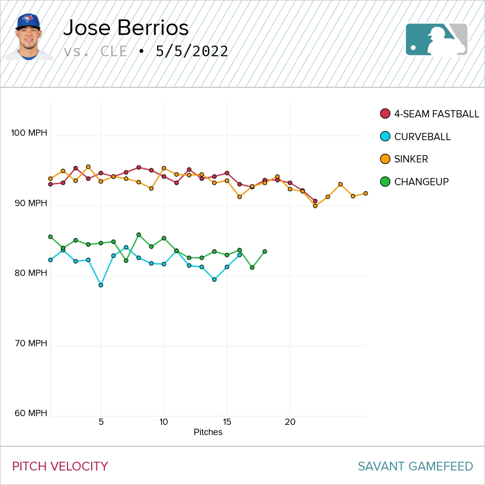 Berrios was off, losing velocity and spin as his start wore on, which explains the fact he missed only four bats on the evening. All 22 batters he faced put the ball in play, half of them at 93 m.p.h. or harder. He didn’t give up anything exceptionally loud, but he didn’t induce much quiet contact, either, getting bled for six runs on eight hits — six of them singles — over 4.2 innings. It was a bit of a weird one.