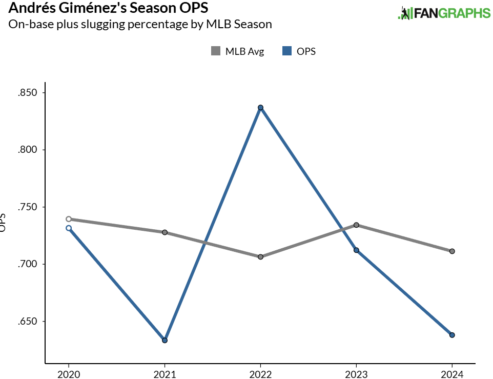 Over the last three seasons, Giménez ranks 26th in the majors in fWAR, narrowly ahead of big names like Xander Bogaerts, Rafael Devers, and Willy Adames. That ranking drops to 53rd over the past two seasons with his career year of 2022 removed, but he remained far more valuable than the average starter. In 2024 he slashed an awful .252/.298/.340 and was still a top-10 player at his position by fWAR.