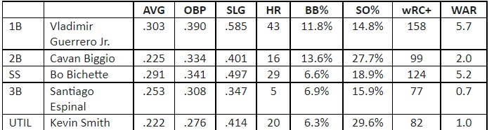 The tandem of Cavan Biggio and Santiago Espinal are presently positioned to receive the bulk of playing time at second and third base, respectively. That’s fine if you’re betting on a substantial bounce back from Biggio, who struggled to an 84 wRC+ over an injury-plagued 2021, and linear extrapolation from Espinal, who quietly posted a 115 wRC+ over 246 plate appearances last season but has yet to prove himself over a larger sample against upper-level competition.