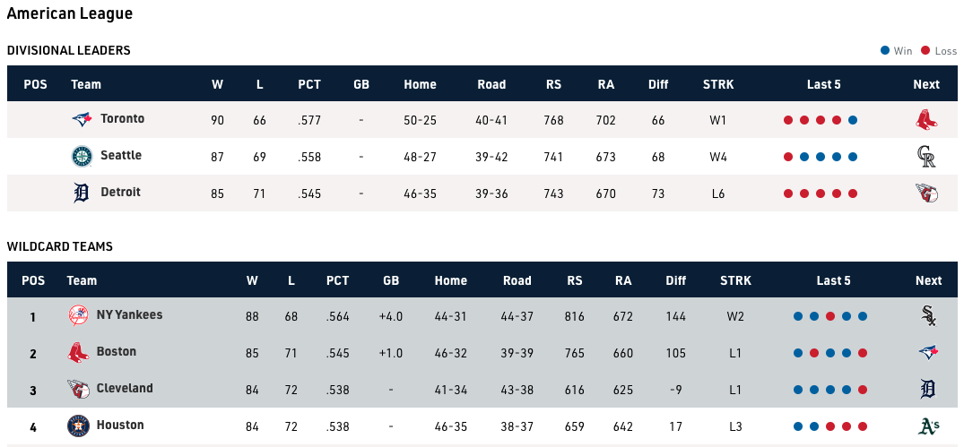 No. 1 and AL East-leading Toronto Blue Jays (90-66): Bye