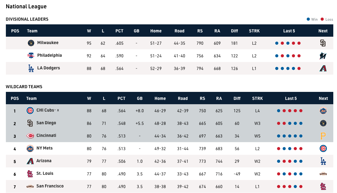 *Reds and Mets are tied at 80-76, but Cincinnati holds the tiebreaker.