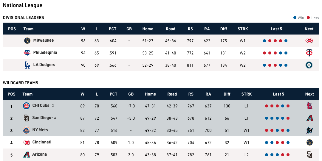 In the National League, the Cincinnati Reds and Arizona Diamondbacks remain in pursuit of the Mets, who retook sole possession of the third wild-card spot with a series win over the Cubs earlier this week.