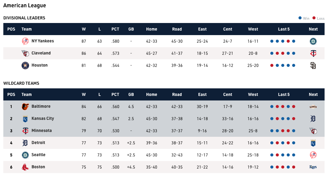 Meanwhile, the Red Sox sit 4.5 games back of the Twins, but would need to jump Minnesota, Detroit and Seattle to secure a post-season spot. Boston is set to host the Twins at Fenway this weekend, so the Red Sox need to take care of business themselves and rely on teams around them to fall out of the race.