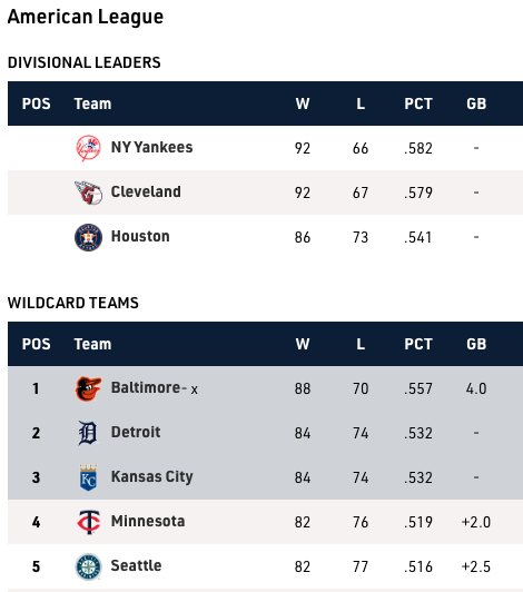 The Mariners, Tigers, Royals and Twins all picked up wins, keeping Detroit and Kansas City two games clear of the others for the final two spots. Meanwhile, the Orioles refuse to go away and let the Yankees clinch the AL East, winning 9-7 in a game that didn't get close until the end.