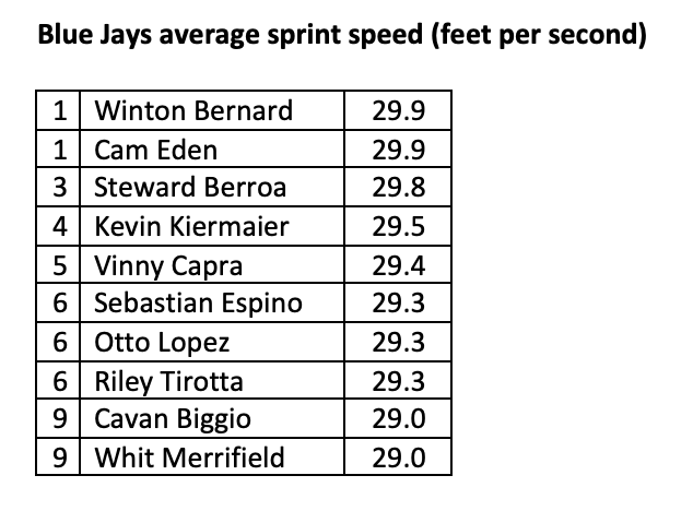 You won’t see Cam Eden’s name high up on too many Blue Jays top prospect lists. A 2019 sixth-round out of Marcus Semien’s old stomping grounds at the University of California, Berkeley, Eden’s primarily known for his outfield defence and speed. And he put plenty of the latter on film at Blue Jays camp this spring, finishing tied with Wynton Bernard for the lead among all players in average sprint speed on the basepaths: