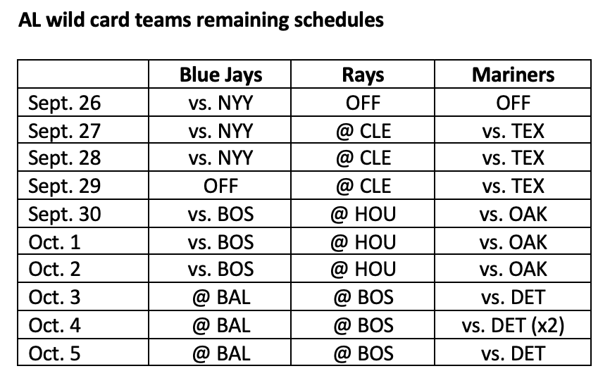 The bad news for the Blue jays is they don’t hold the hammer in any tiebreaker scenario. The only way Toronto can earn home-field advantage in the wild card round is by finishing with more wins than both Seattle and Tampa. The good news is they begin the week leading the race and can play one game worse than those two teams over the next 10 days and still host a wild card series.