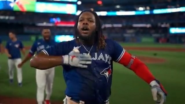 The line was poking fun at Guerrero Jr. for his celebration after his walk-off single in Monday's dramatic 3-2 win in 10 innings.