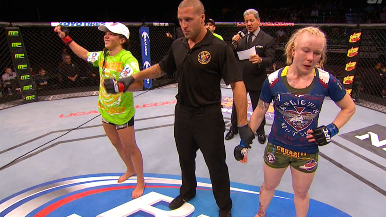 Leslie Smith made quick work of Jessamyn Duke in women’s bantamweight action. Smith blitzed Duke, a teammate of Ronda Rousey, with a combination of kicks and punches in the first round. Smith (7–5–1) mixed in hard body shots that dropped Duke (3-2, 1 NC) and forced the referee to step in.