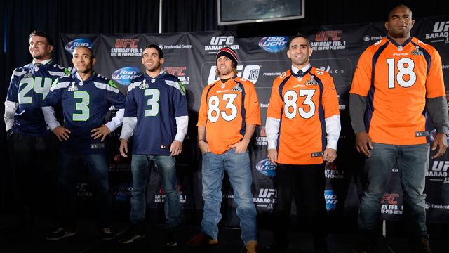 UFC heavyweight Alistair Overeem wore a Peyton Manning jersey and the 135-pound champion Renan Barao countered with Russell Wilson’s No. 3 when the fighters lined up for a post-press conference photo opp at MSG.