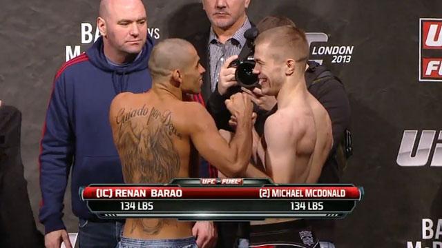 Interim bantamweight champion Renan Barao and challenger Michael McDonald both made weight with a pound to spare Friday ahead of their UFC headliner at Wembley Arena in London, England.