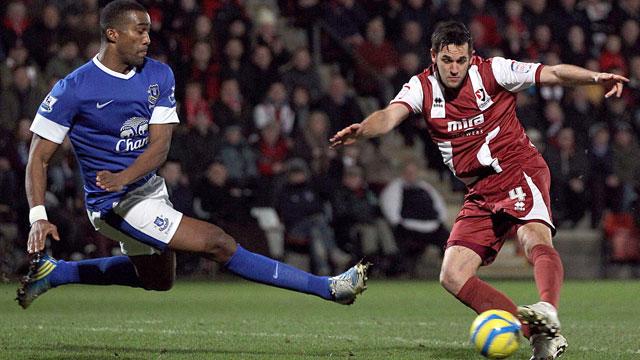 Russell Penn pulled a goal back for the hosts but Seamus Coleman lobbed Everton’s fourth and Marouane Fellaini, who was involved in both Everton’s early goals, turned victory into a rout in the 89th minute. Jelavic had reacted first after Fellaini’s angled shot hit the far post and the Belgium international also won the penalty tucked home by Baines.