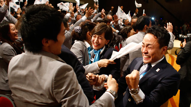 Even though it was 5 a.m. Sunday in Japan, about 1,200 dignitaries and Olympic athletes who crowded into a convention hall in downtown Tokyo celebrated the news. Cheers of “Banzai!” filled the hall when the announcement was made.