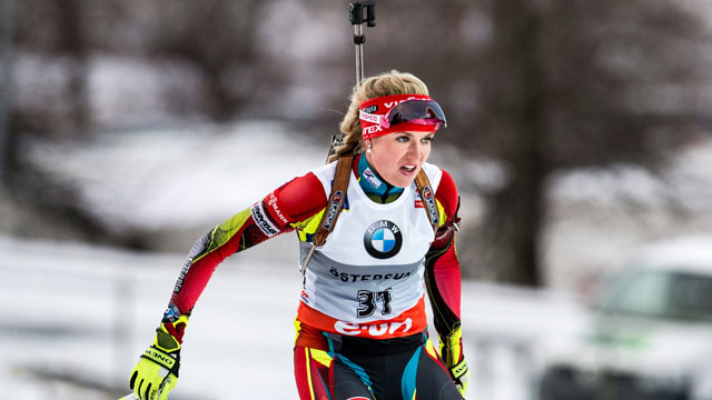 Olympic bronze medallist Marie-Laure Brunet of France was in the lead after the third shooting range, but missed a target in the fourth and ended third, 16.2 seconds back.