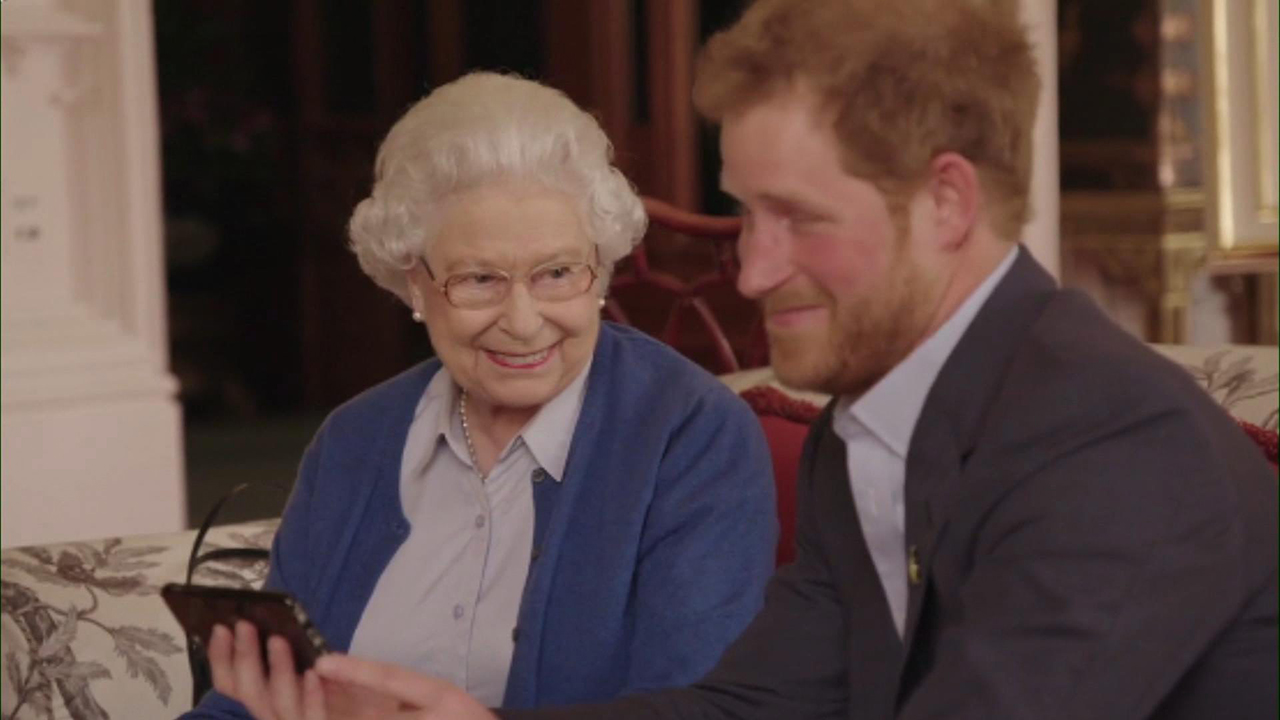 The video starts with Harry and the queen looking at an Invictus brochure when they get a video phone message from Mrs. Obama. It shows the Obamas accepting Harry’s challenge to the Invictus Games, with a man in uniform behind them saying "Boom!"