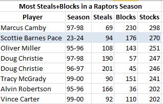 Almost everyone has contributed to the strong defence, which ranks seventh overall and fourth in the halfcourt so far. Barnes has been unlocked being used primarily in the lower half of the floor, as we’ve suggested and discussed on The Raptors Show, and could threaten Marcus Camby’s team record for steals-plus-blocks in a season. Pascal Siakam’s offensive struggles have not at all carried over to the defensive end. Schroder has filled in for All-Hands Team player Fred Van Vleet.