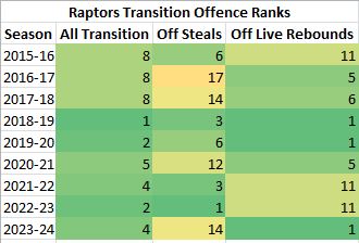 There are a lot of reasons to prioritize forcing turnovers on defence. For one, live-ball turnovers are the surest bet for points in the other direction, so they have both a scoreboard and a psychological swing effect. One of the unsaid reasons the Raptors emphasized the steal is that their halfcourt offence was not particularly strong. To wit, the Raptors pulled off a rare feat last year of being 25th in halfcourt offence but 12th in offence overall; that was thanks to a terrorizing transition attack.