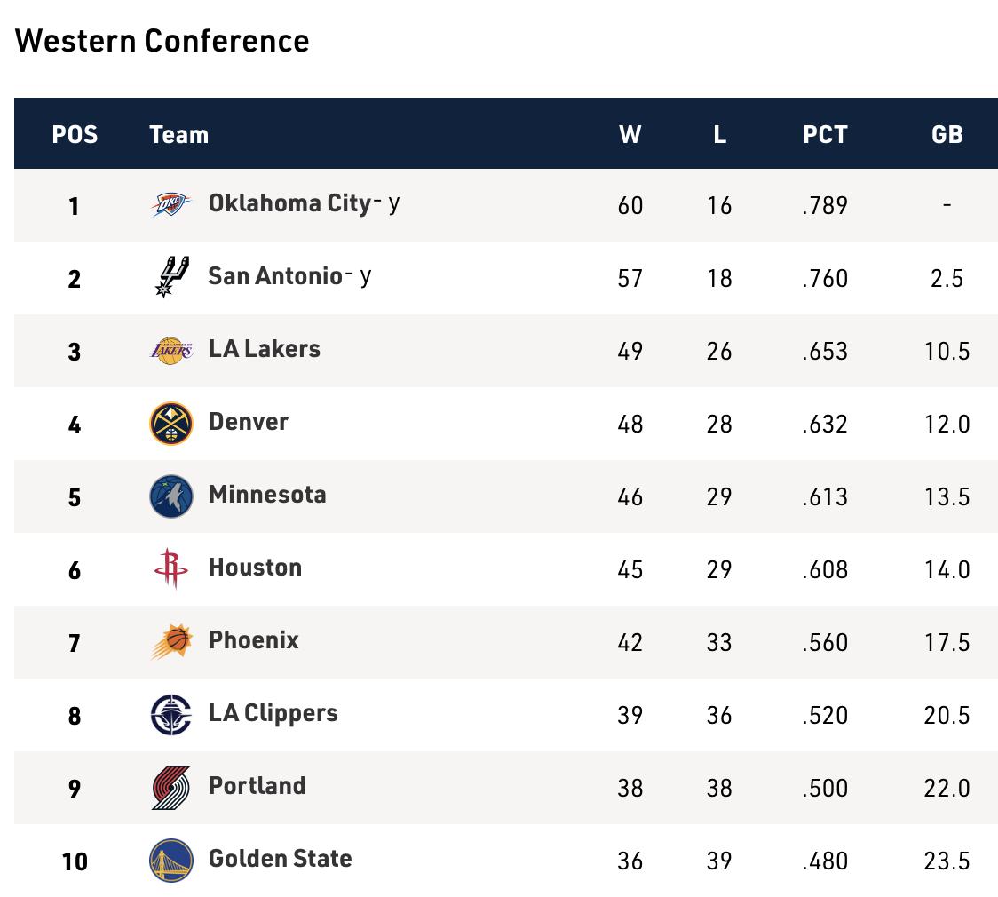 Behind the top two, just 3.5 games separate the No. 3 Lakers and No. 6 Rockets. The Lakers have gone 14-2 in March and recently won nine straight games, with Luka Doncic averaging 37.2 points, 8.2 rebounds, 7.1 assists and 2.3 steals per game in the month.