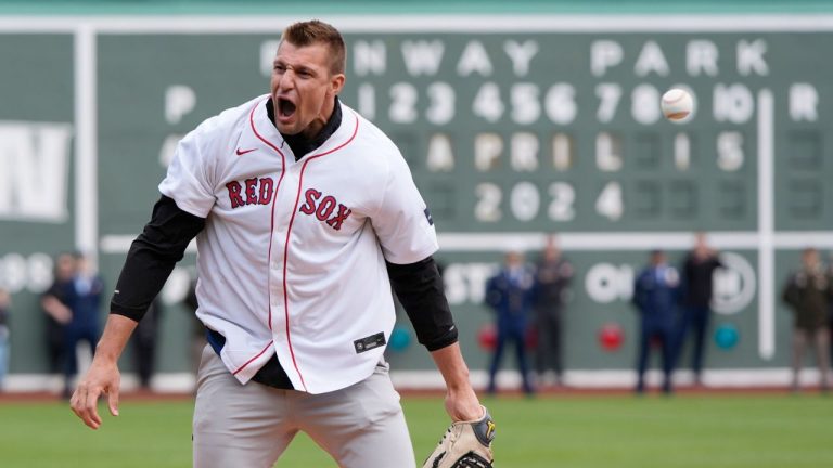 The legendary New England tight end took the mound ahead of the Boston Red Sox games against the Cleveland Guardians on Monday to deliver the ceremonial first pitch on Patriots Day.