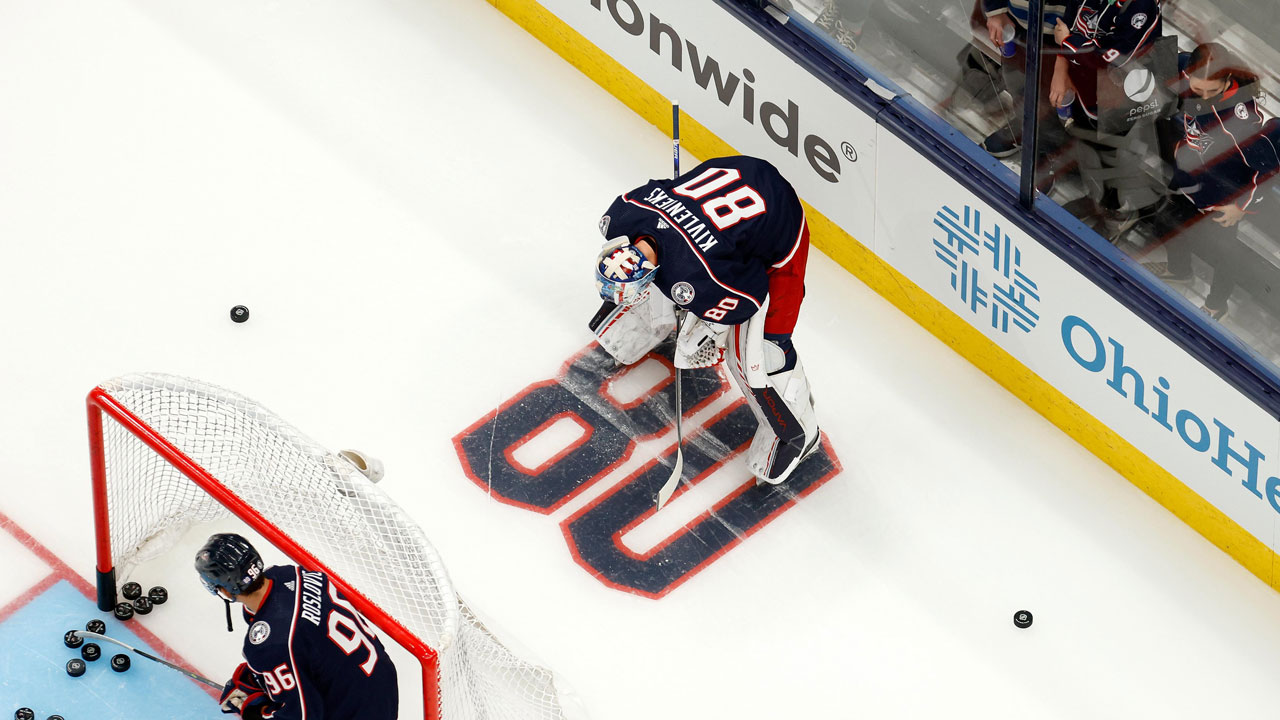 Columbus Blue Jackets goalie Elvis Merzlikins taking warmups while wearing Matiss Kivlenieks’ No. 80. (NHL/Twitter)