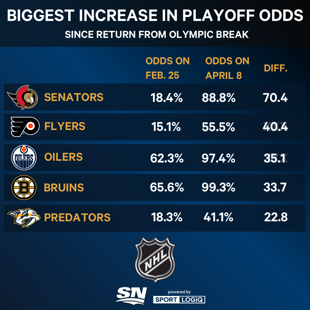 By going 15-6-1 since the NHL restarted Feb. 25, the Flyers have improved their playoff odds by 40.4 percentage points — second only to the Ottawa Senators, whose playoff odds have risen by 70.4 percentage points.