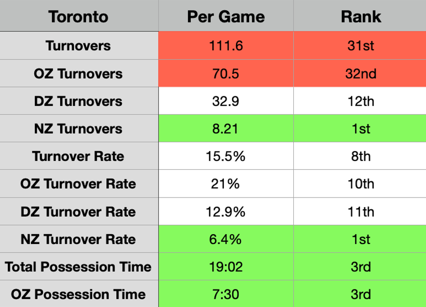 Because of that, SportLogiq uses the clear explanation of “a change of possession,” which also gives us a much larger sample size, which helps us hone in on the answers we’re seeking. Further to the Leafs showing up at 31st in this stat (ahead of only the Winnipeg Jets, and just behind Vegas), the Leafs are 32nd out of 32 teams in the NHL in offensive zone turnovers.