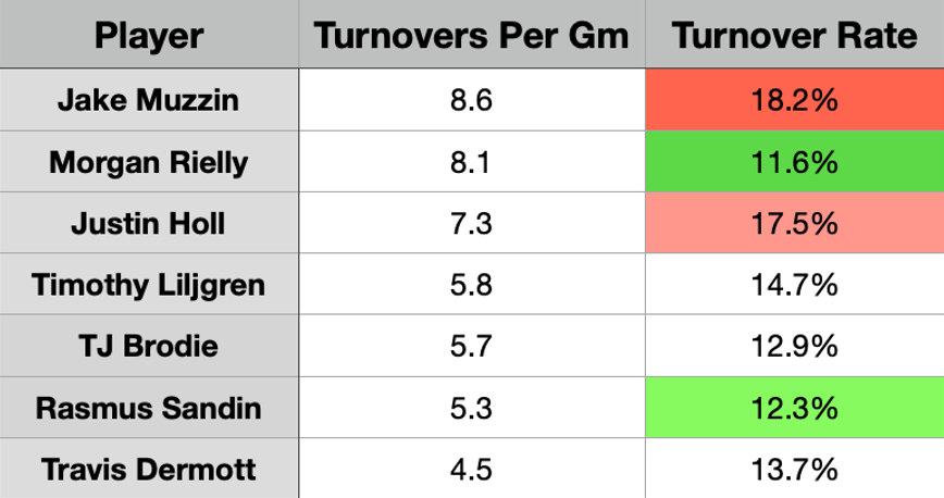 What is notable to me is that the guy they just gave the big deal to, the guy who plays the most on the team, has got the best turnover rate. Somewhat surprisingly, Morgan Rielly leads the Leafs in total possession time – just ahead of Matthews – and yet he turns the puck over a bit more than a tenth of the time. Rielly is a major “you don’t know what you’ve got ‘til it’s gone” player for Leafs fans, though internally they seemed to recognize how important it was to keep him around.