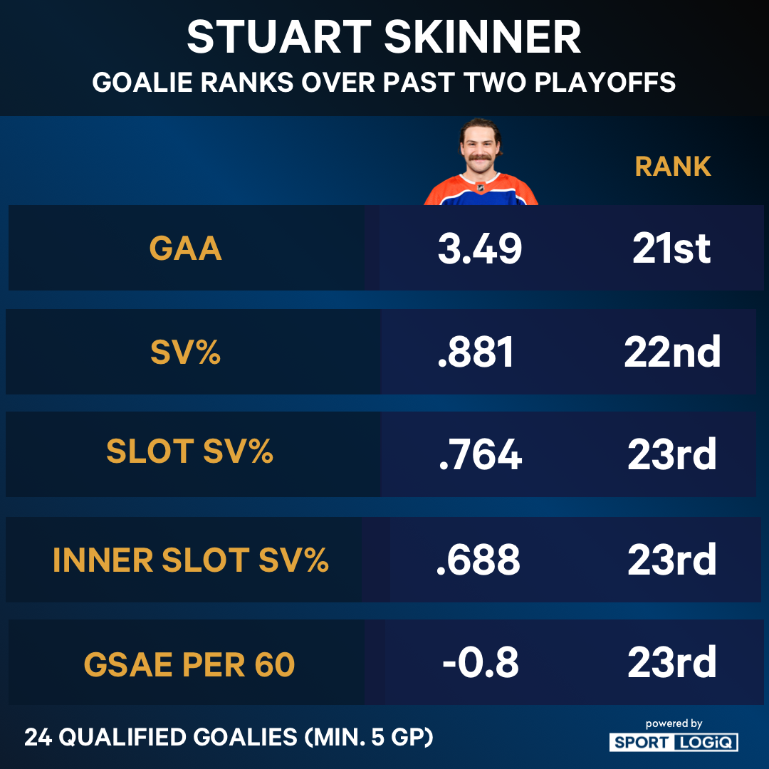 Skinner’s playoff struggles date back to last season, when the then-rookie goaltender was pulled three times during Edmonton’s six-game series loss to the Vegas Golden Knights. He ranks near the bottom of several important categories over the past two post-seasons.