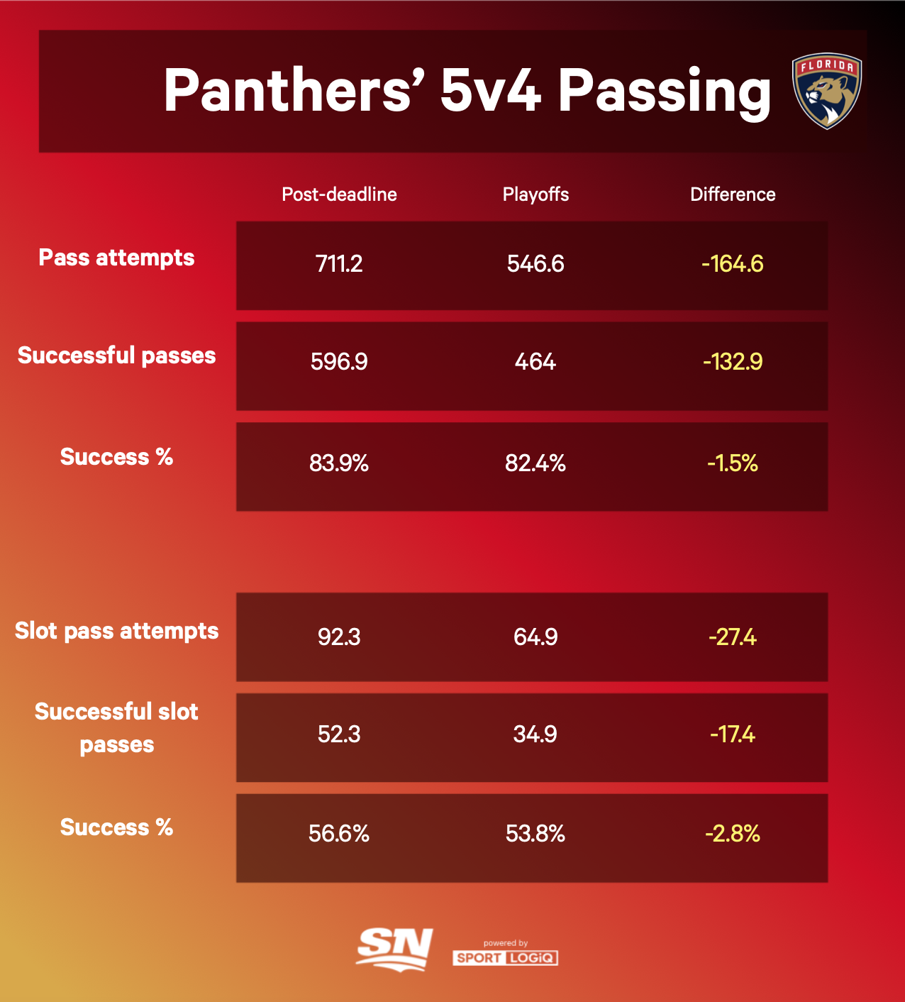 What also may be influencing the danger of the Panthers’ shots in is their passing. Florida had a ton of puck movement over that last month-plus of play, and that’s dropped off across eight games as well. That likely influences why Reinhart and Giroux are shooting less than in the regular season.