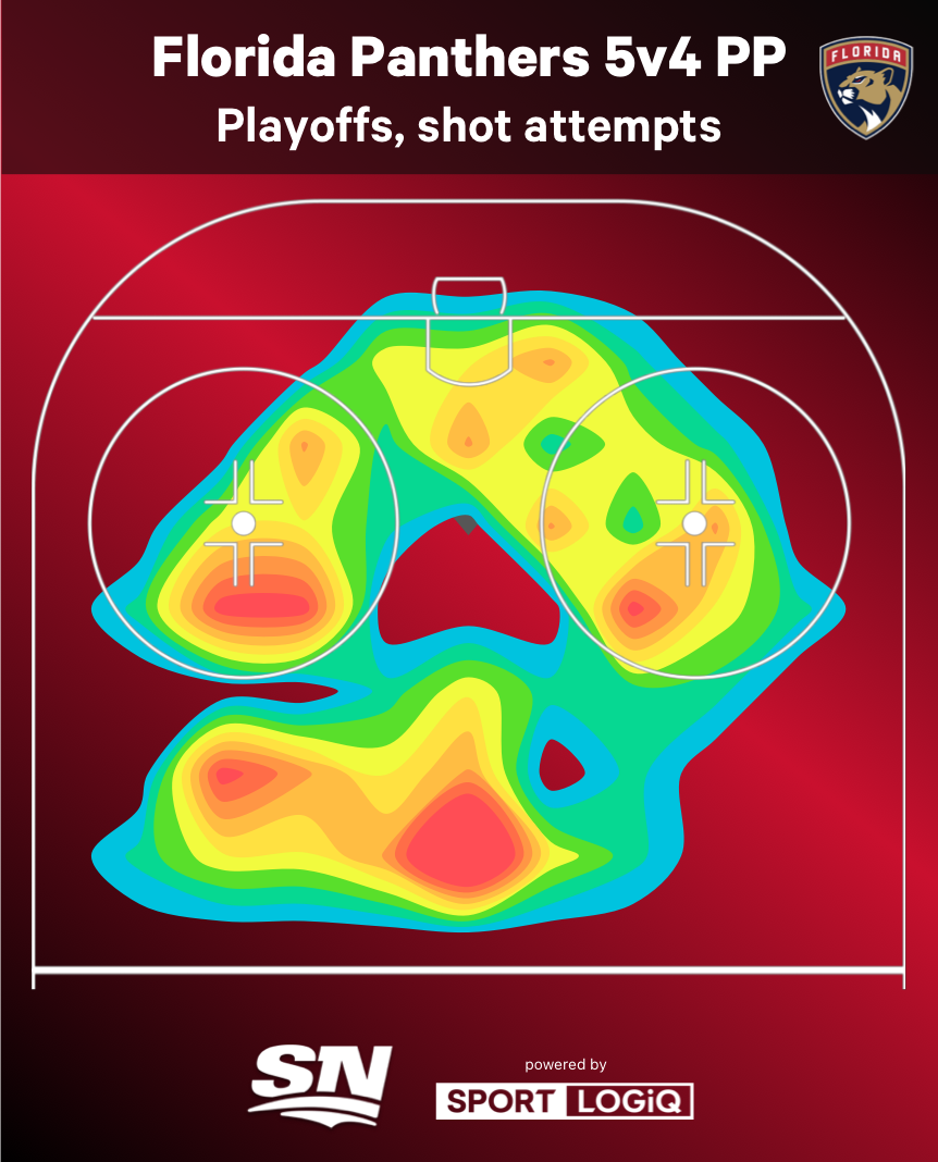 It’s not a matter of shot quantity on the surface — Florida’s attempted a similar rate of shots on 5-on-4 power-play opportunities. There’s some differences on where those shots are coming from, and who.