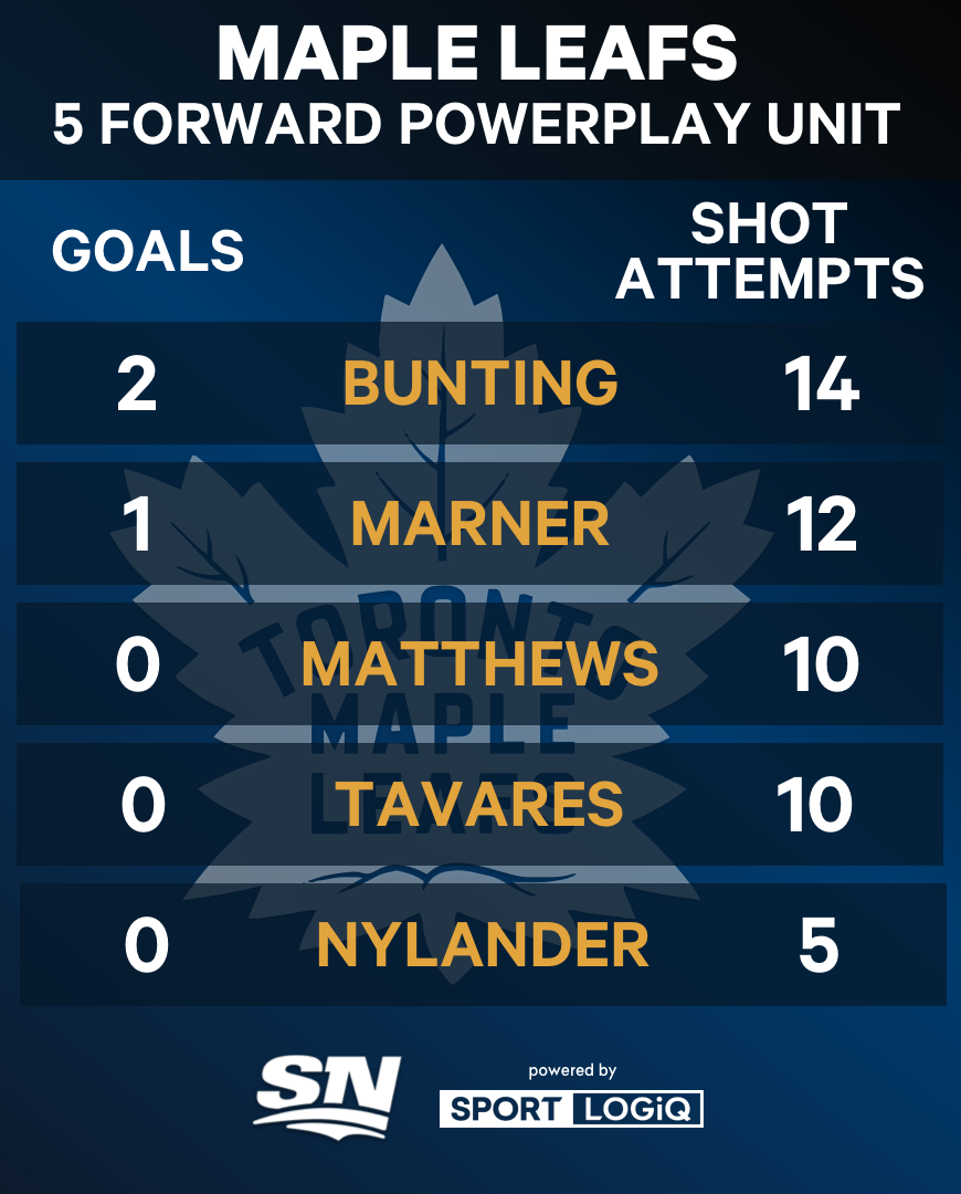 Although NHL coaches have been slow to embrace the five-forward setup, it has gained some traction this season, including in Toronto. Over the past seven games, the Maple Leafs’ No. 1 power-play unit has featured Michael Bunting, Mitch Marner, Auston Matthews, William Nylander and John Tavares. (Other teams that have deployed five-forward units this season include the Blackhawks, Bruins, Canadiens and Panthers.)