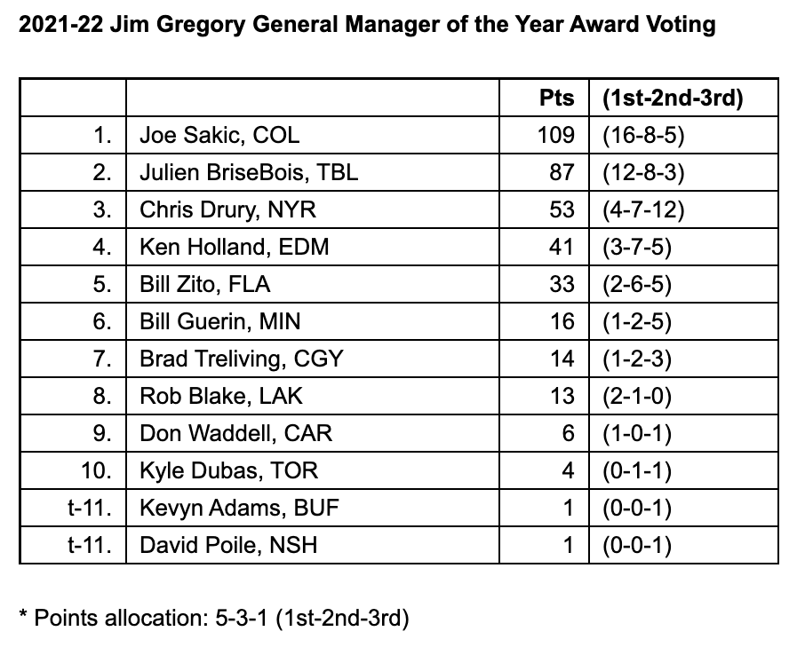 Joe Sakic was named the NHL's general manager of the year at the 2022 NHL Draft, following a season in which he oversaw a Stanley Cup champion.