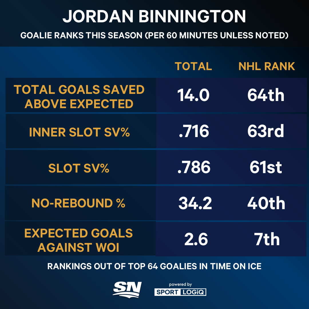 Since then, however, Binnington has a quality-start rate of 45.5 per cent (10/22) in the playoffs with zero steals, which occur when a goaltender’s GSAE is greater than the final score differential. He made just three quality starts during the Blues’ seven-game loss to the Winnipeg Jets in the first round last year.