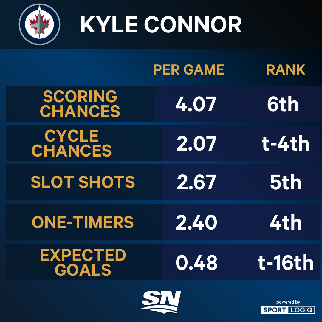 Connor, who has seven goals in his past four games, has credited linemate Mark Scheifele for his scoring outburst. Scheifele’s playmaking prowess has been on full display this season, ranking tied for 10th in completed slot passes per game. Ten of Scheifele’s 13 assists are primary, half of which have directly led to Connor goals.