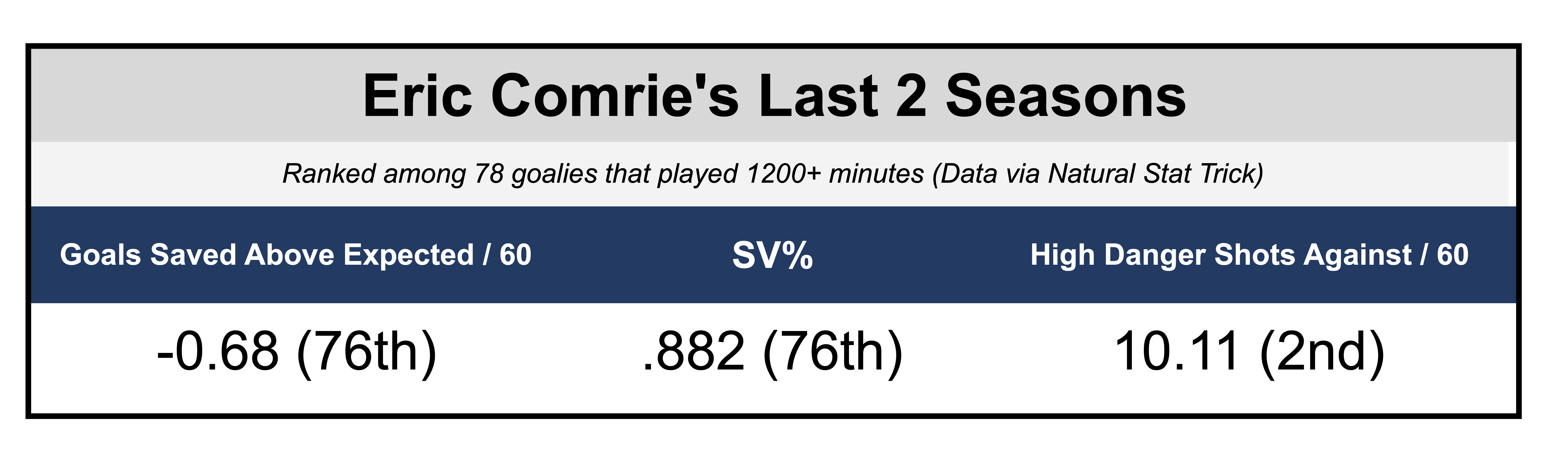 Comrie’s best stretch of NHL action was with Winnipeg during the 2021-22 season. In 19 games, he posted a .920 save percentage and ranked second in Goals Saved Above Expected per 60 minutes (0.603) among goalies who played at least 15 games, according to MoneyPuck.com.