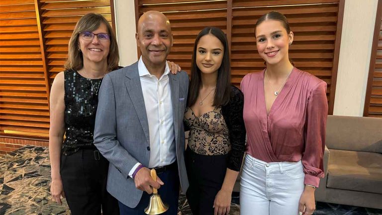 The 59-year-old Maharaj received treatment in Toronto, and he triumphantly rang the ball at a party last weekend to celebrate.