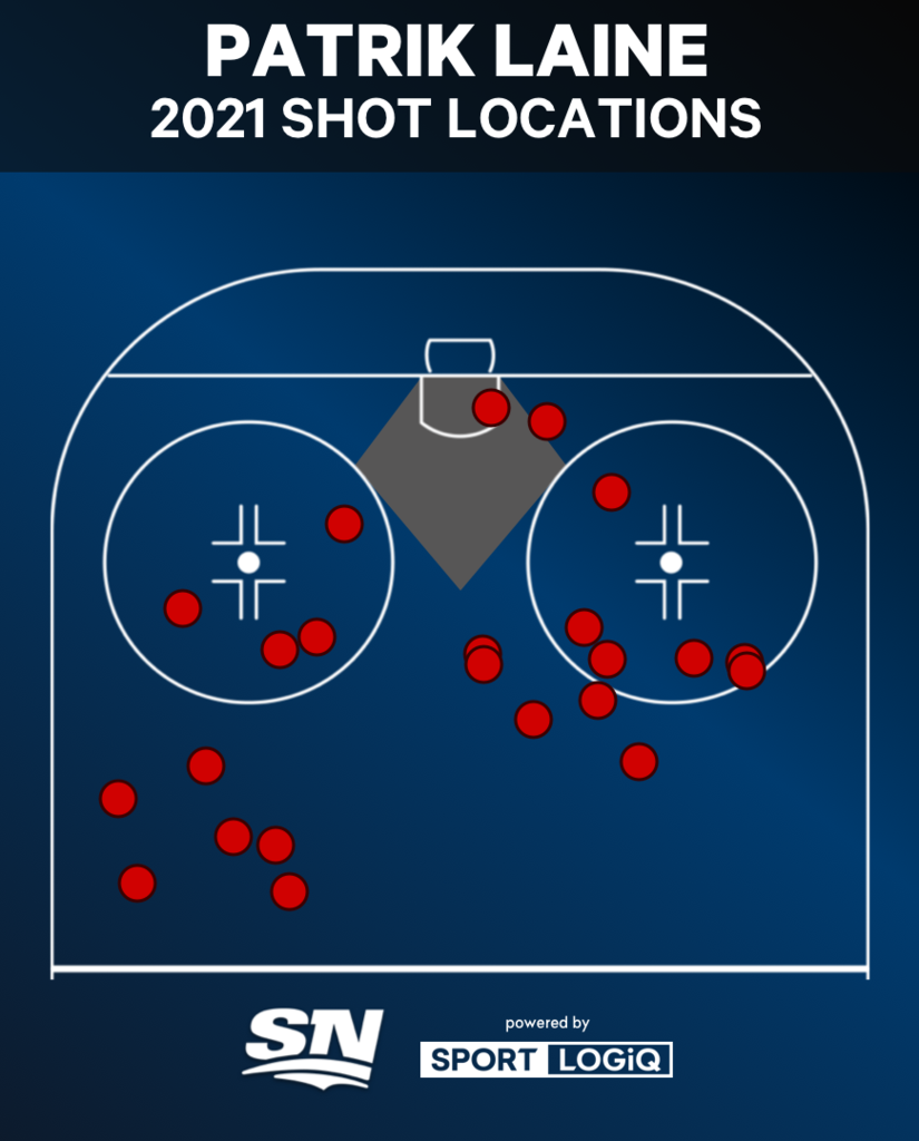 Laine played the same F3 role in Winnipeg and was still able to produce shots and goals from more dangerous areas more often.