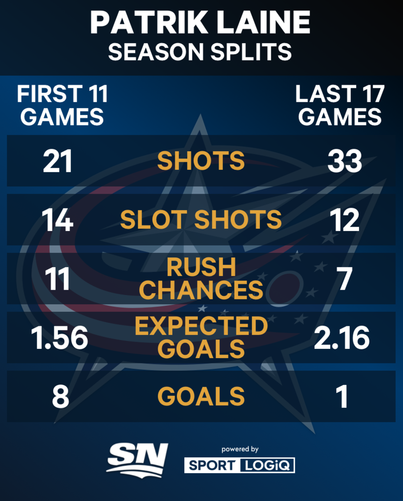 So, it shouldn’t come as a surprise that Laine got off to a hot start this season, scoring eight goals in his first 11 games, and has followed that with one goal in his past 17.