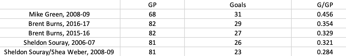 In the salary cap era, only one defenceman has scored 30 goals in a season — Mike Green hit 31 in 68 games with the 2008-09 Capitals. He had 73 points that season, too, and a 1.07 points per game mark that also stands as the best offensive season by a defenceman since 2005-06.