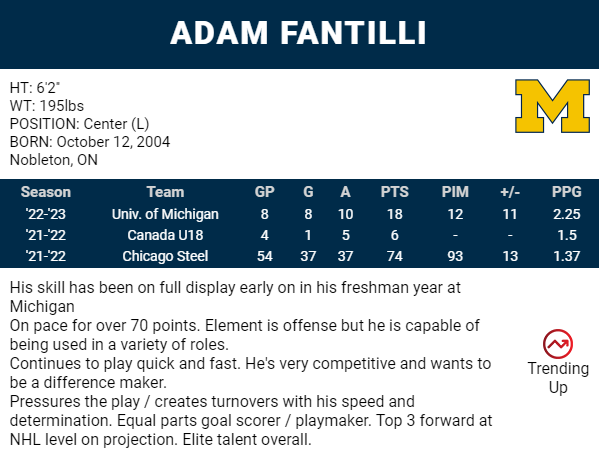 Fantilli continues to dominate at Michigan. One of our "players to watch" at the top of this draft when the season began, he’s a highly touted prospect and is making a statement early on.
